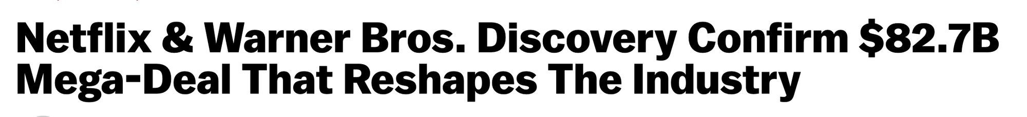 모든 분석가들의 예상을 뒤엎고, 넷플릭스가 워너브라더스 디스커버리(WBD)의 워너브라더스 스튜디오와 HBO MAX를 포함한 스트리밍 및 스튜디오 사업을 무려 729억 달러(부채 포함 시 827억 달러) 규모의 거래로 인수한다고 발표했습니다. 이 대규모 거래는 규제 당국의 승인을 거쳐 2026년 중반 이후에 마무리될 예정입니다.