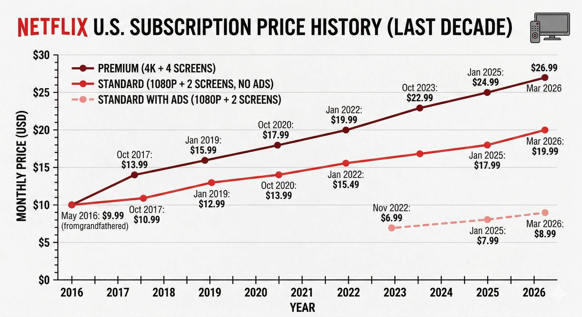 2026년 3월 넷플릭스는 미국 요금제를 인상했습니다. 광고 요금제, 스탠다드, 프리미엄 요금제 모두 인상되었으며, 이는 약 1년 만의 가격 인상이었습니다.